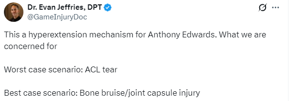关于爱德华兹的伤势,医学众人Evan Jeffries暗意,爱德华兹的膝盖过度伸展,目下令东说念主缅思的是,最坏情况是前交叉韧带扯破;最佳的情况是骨挫伤能够重要囊挫伤。